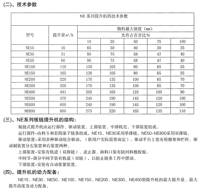 NE15板鏈式斗式提升機適用溫度:被輸送物料溫度不得超過250℃
